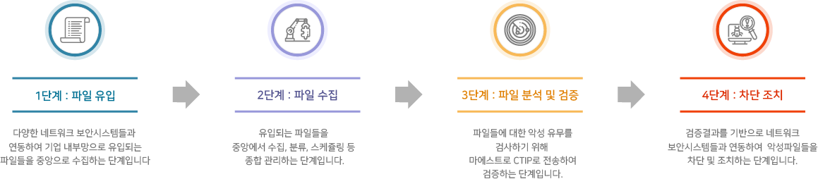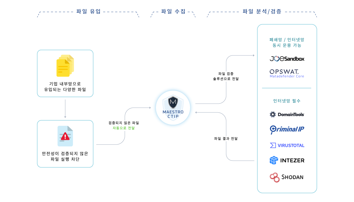 기업 내부망으로 유입되는 파일들을 자동으로 검사, 분석, 차단 할 수 있는 『사이버 보안 위협 인텔리전스 플랫폼』입니다.