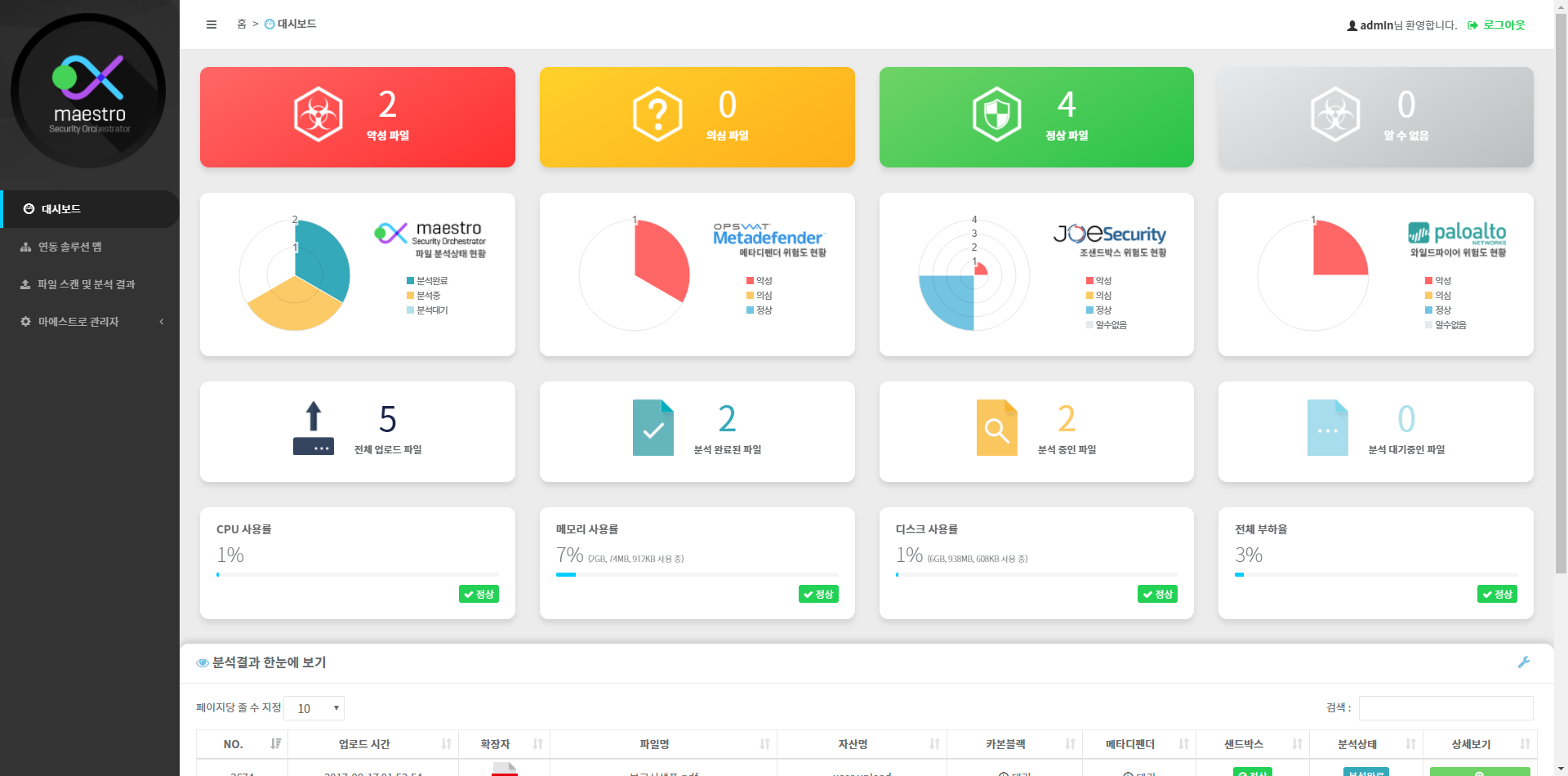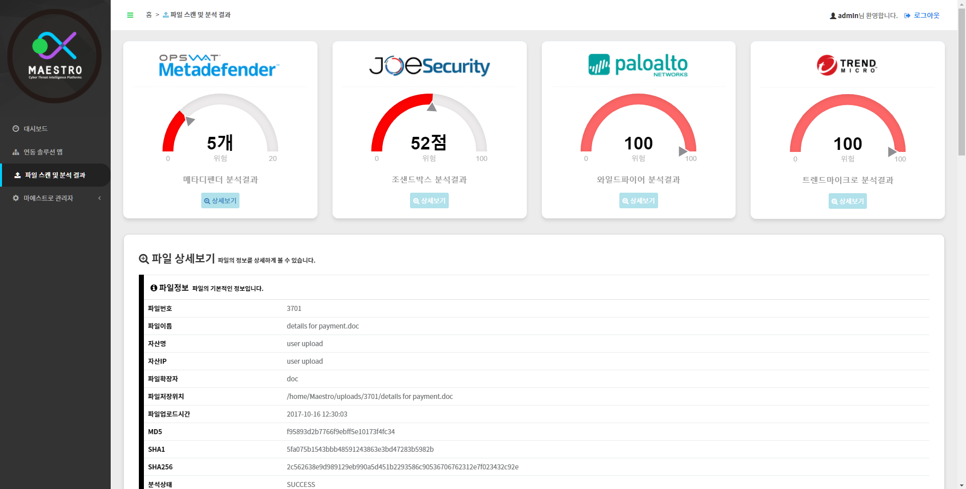 『마에스트로 사이버 보안 위협 인텔리전스 플랫폼』은 『악성코드 통합 검역 시스템』으로서 기업 내부망으로 유입되는 파일들에 대한 악성여부를 자동으로 검증 및 분석하고 차단하는 『지능형 보안 인텔리전스 플랫폼』입니다.