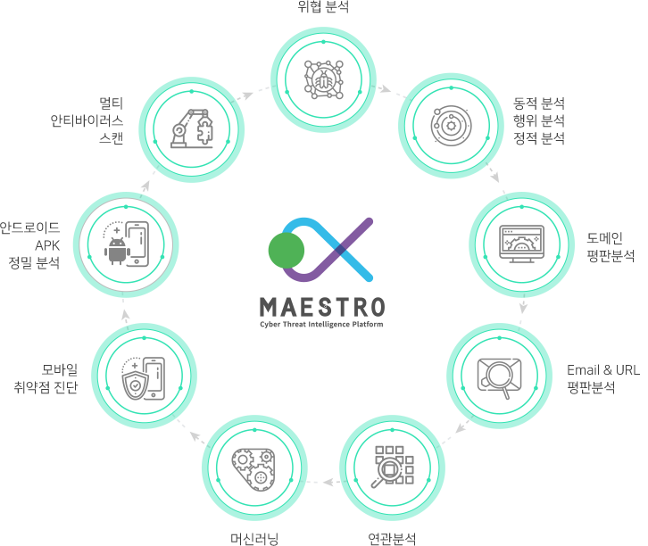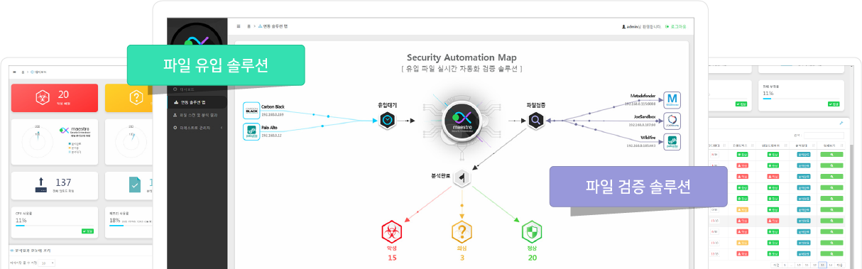 다양한 보안 솔루션들을 [ 마에스트로 사이버 위협 인텔리전스 플랫폼 ] 과 연동하여 기업 내부로 유입되는 파일들에 대하여 악성코드 여부를 자동으로 진단할 수 있습니다.