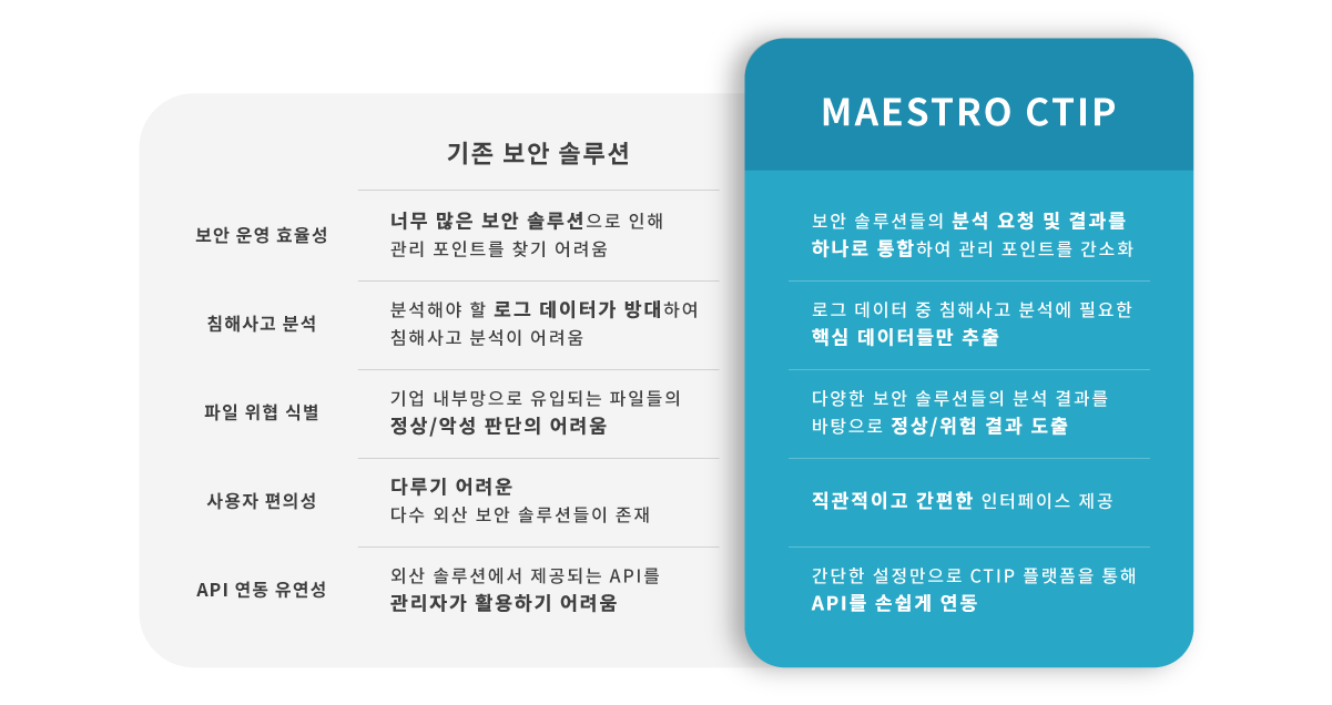 기존 보안 솔루션이 알려진 위협에 대한 시그니처 기반 대응에 한정되는 반면, [마에스트로 사이버 보안 위협 인텔리전스 플랫폼]은