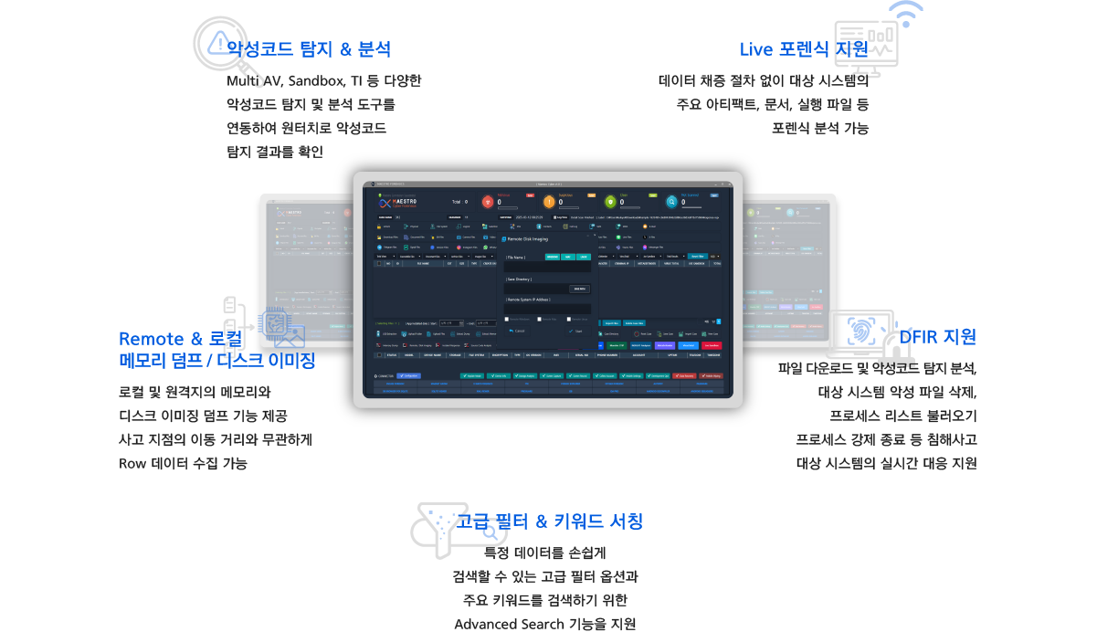 MAESTRO CYBER는 네트워크를 이용하여 대상 시스템의 원격 포렌식과