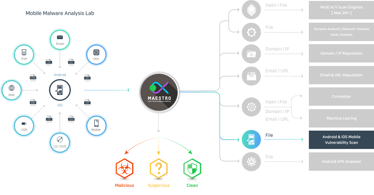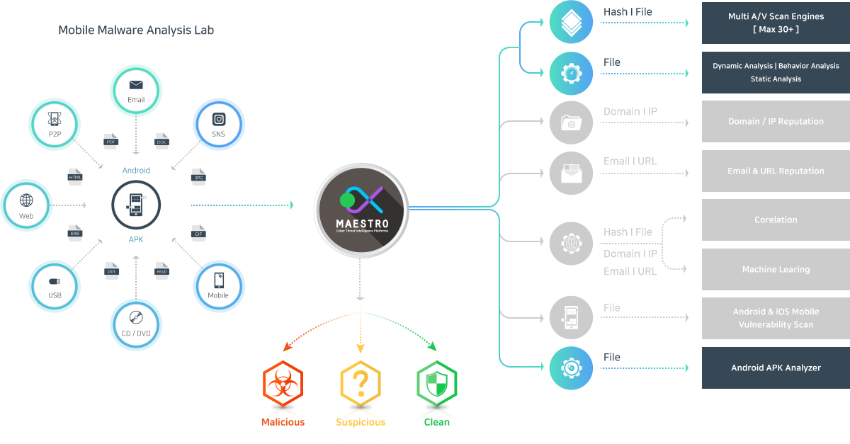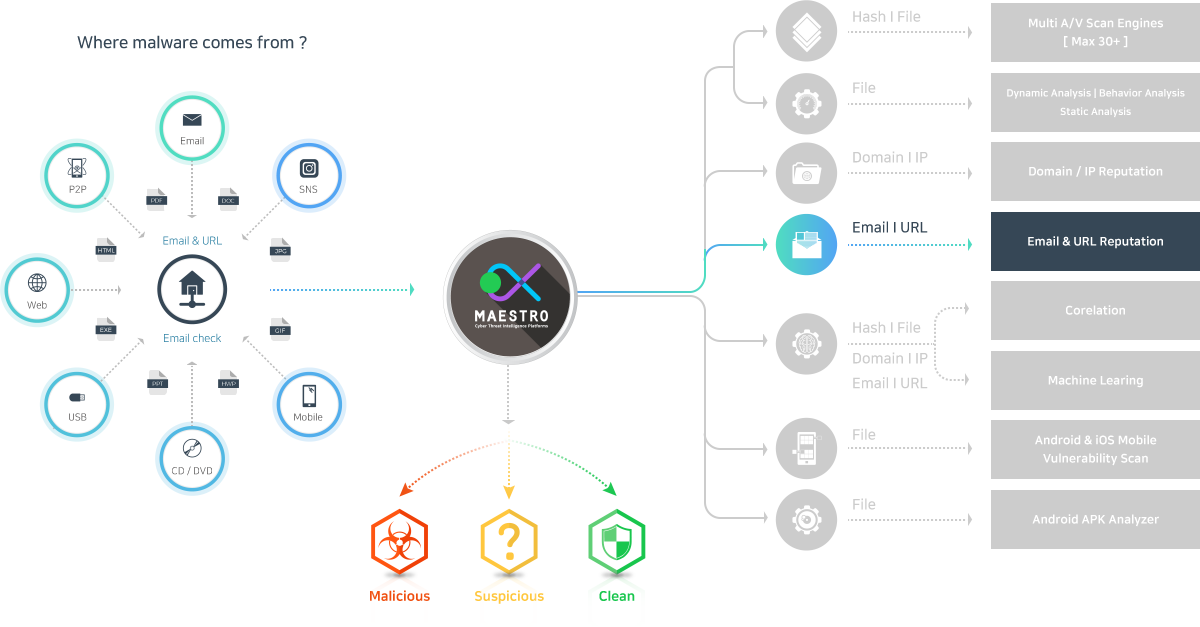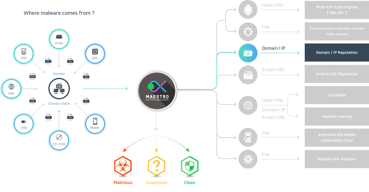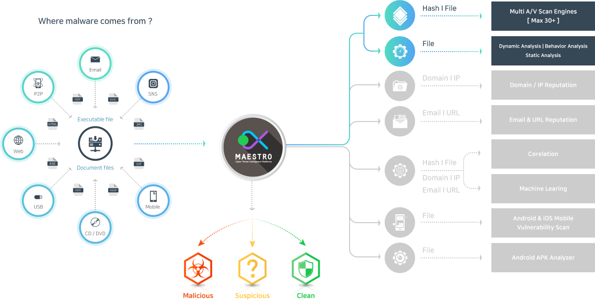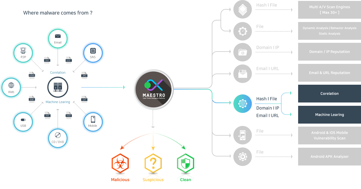 MAESTRO CTIP can rapidly detect and prevent cybersecurity threats through correlation analysis, machine learning and artificial intelligence after analyzing risk factors based on the various of files, domain, URL, IP and email, etc.