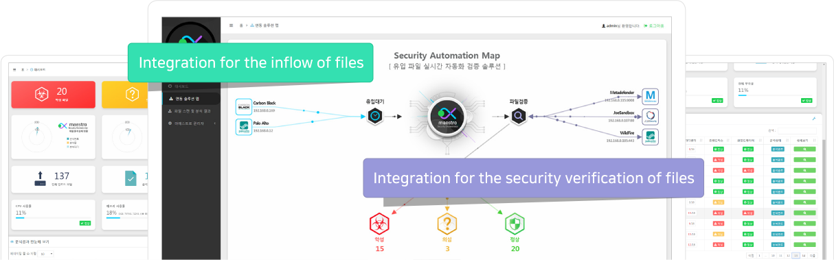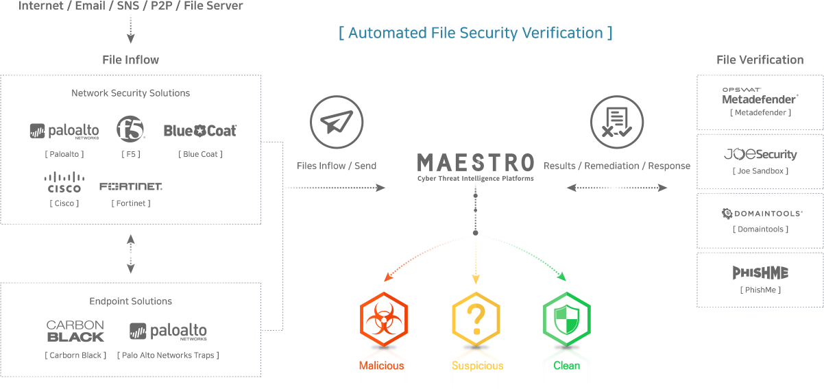 Integrating various network and endpoint security products into single platform. Detecting and preventing advanced threats, unknown malwares such as Ransomware, APT attack coming into an internal network. MAESTRO CTIP provides safe and stable network.