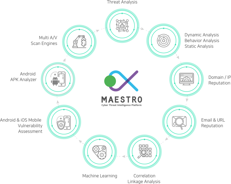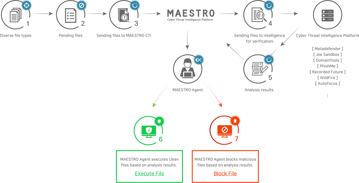 To increase the rate of detection and prevention of advanced cyber threats, MAESTRO CTIP uses multi A/V scan engines, malware sandbox, Domain / IP / URL / Email reputation services, machine learning, artificial intelligence, whitelist reputation DB, etc.